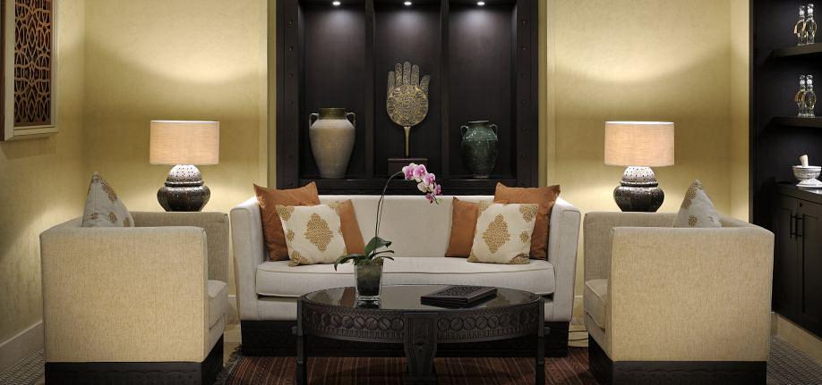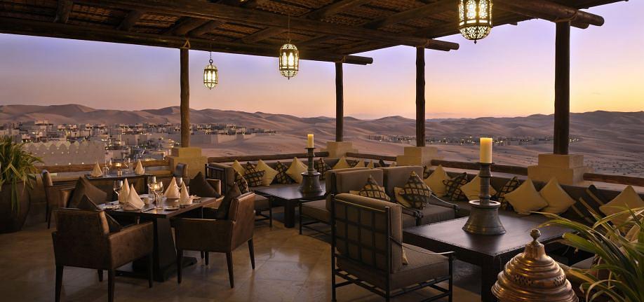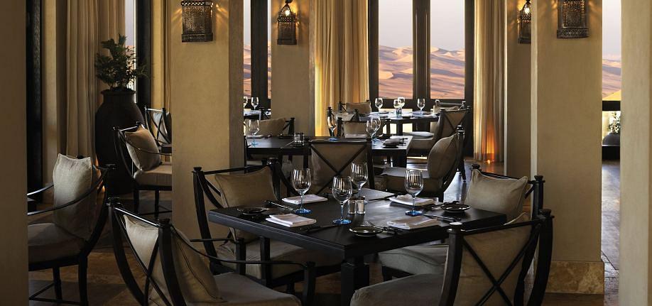 U restoranu Al Waha poslužuju se vrhunska jela arapske kuhinje, a u restoranu Suhail francuski specijaliteti. Restoran Ghadeer uz bazen poslužuje lagane obroke i mediteranska jela. Uz rezervaciju polupansiona moguće je uz doručak odabrati ručak ili večeru u restoranu Al Waha. Gosti u Royal Pavilion Villa smještaju mogu za ručak birati restoran Al Waha ili The Restaurant, a večera je uključena u restoranu The Restaurant.